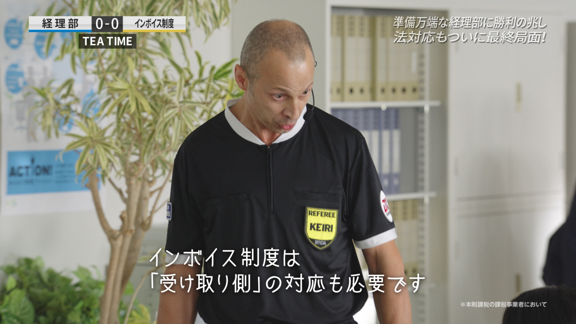 経理部のオフィスになぜかいる審判が、滝藤さんと横澤さんの様子をじっと監視しています。滝藤さんが、取引先から電子発行された請求書を紙に印刷してファイルに保存しようとした瞬間、審判が勢いよく駆け寄り出したのはイエローカード。法対応の期限が迫っていることを噛み締める滝藤さんと、隣で励ます横澤さんの表情も見どころです。